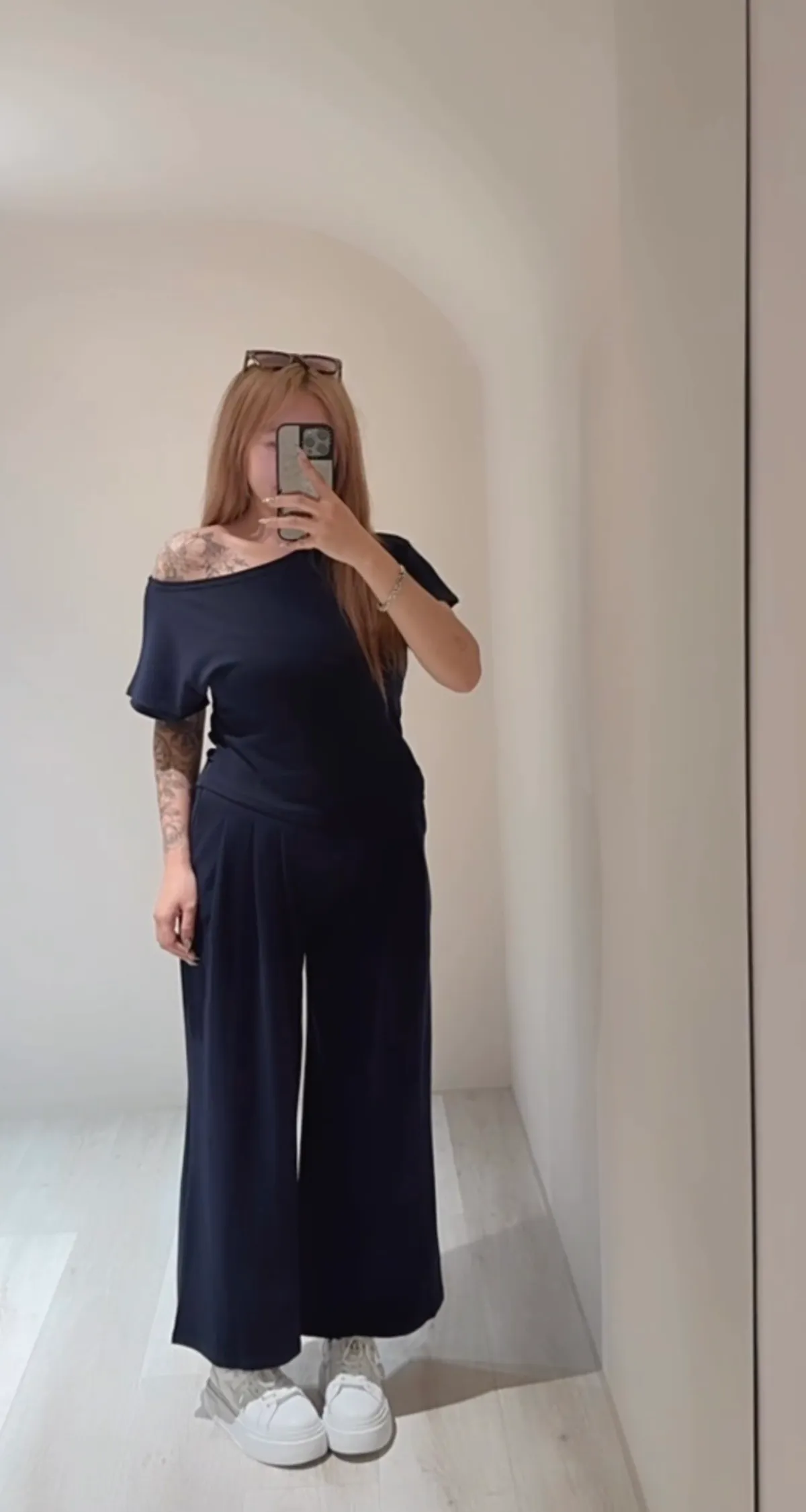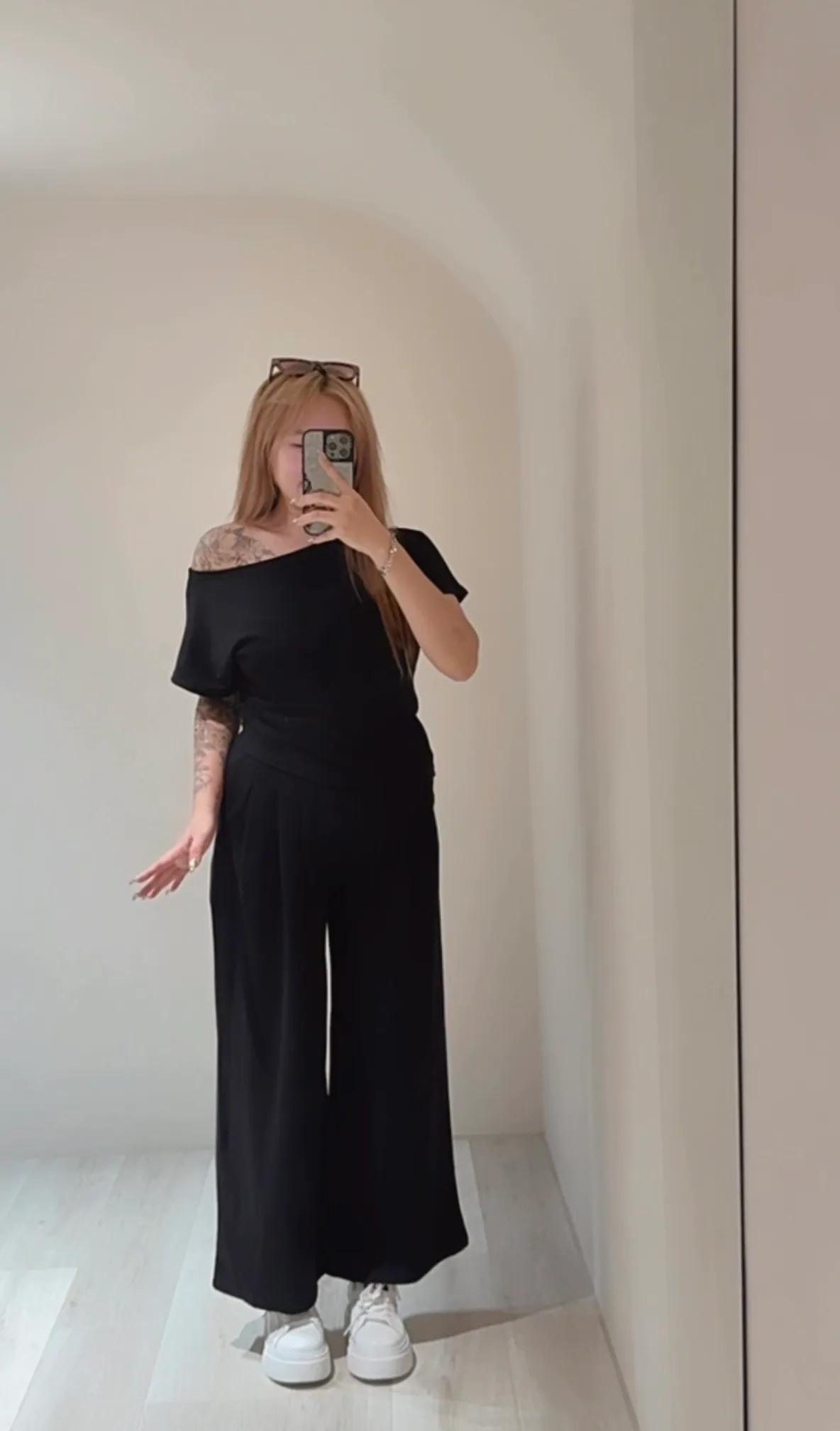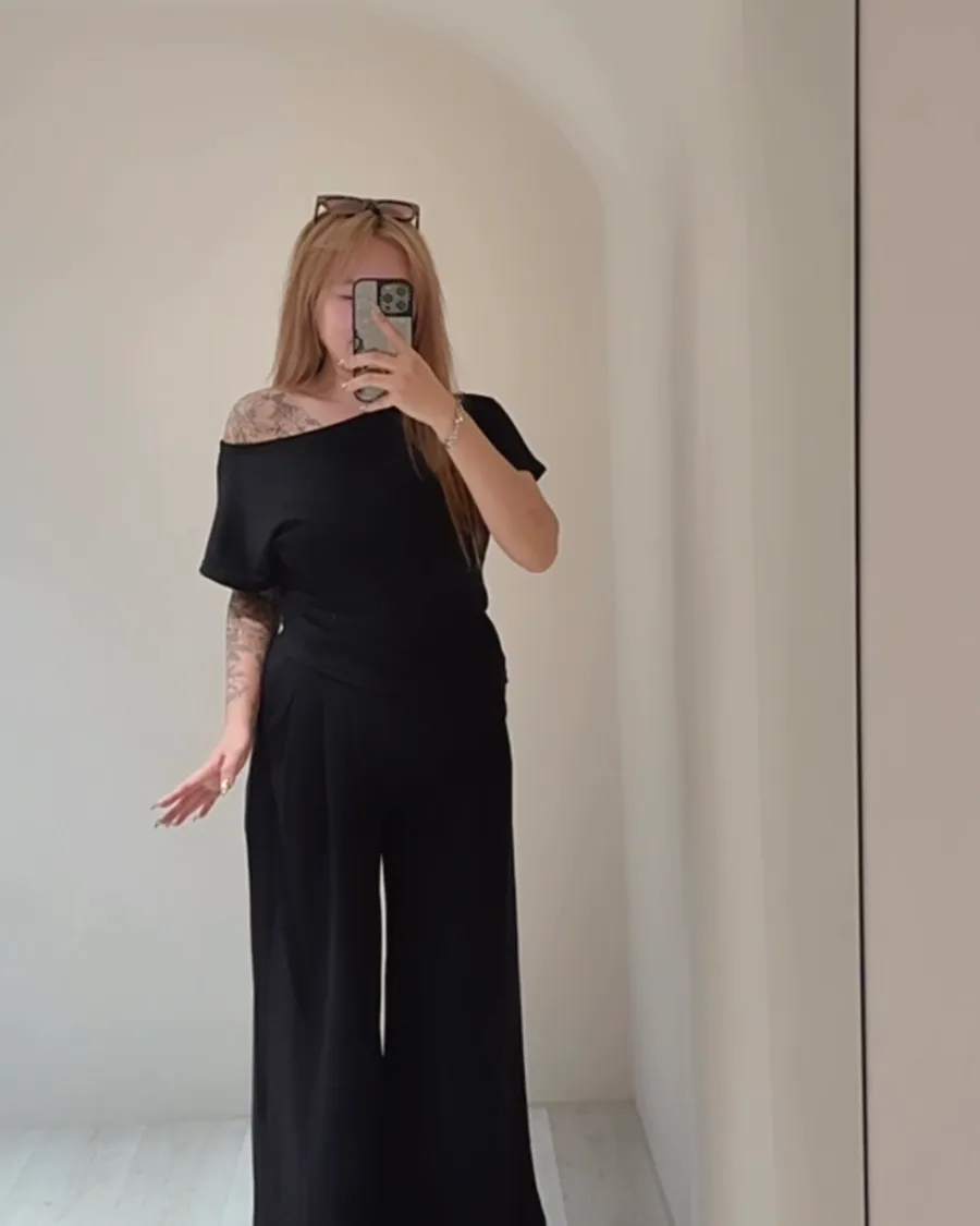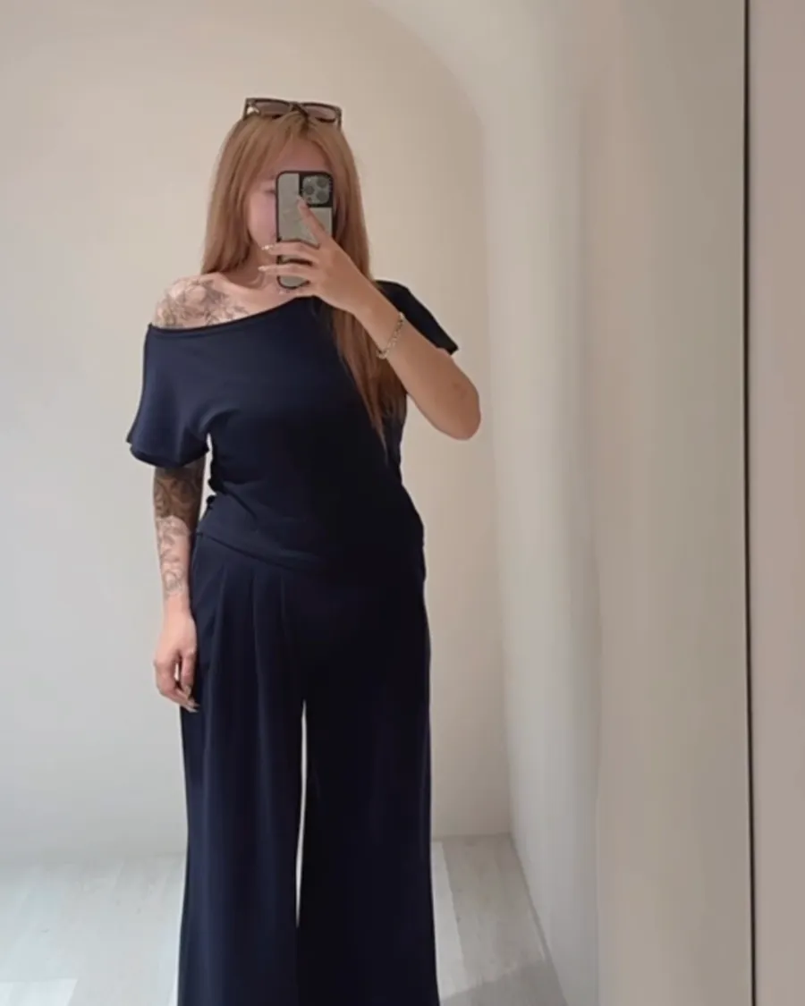 視覺增高小個子天菜!不規則露肩寬褲套裝