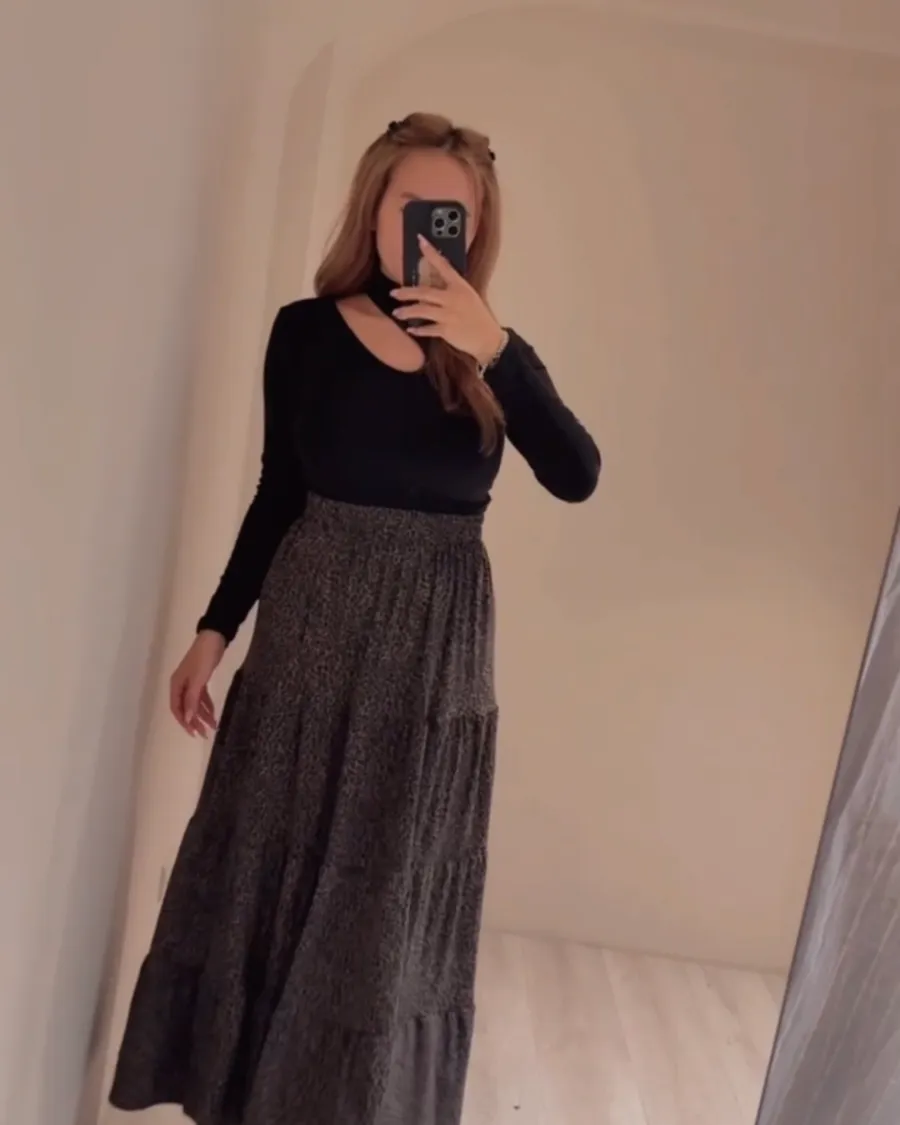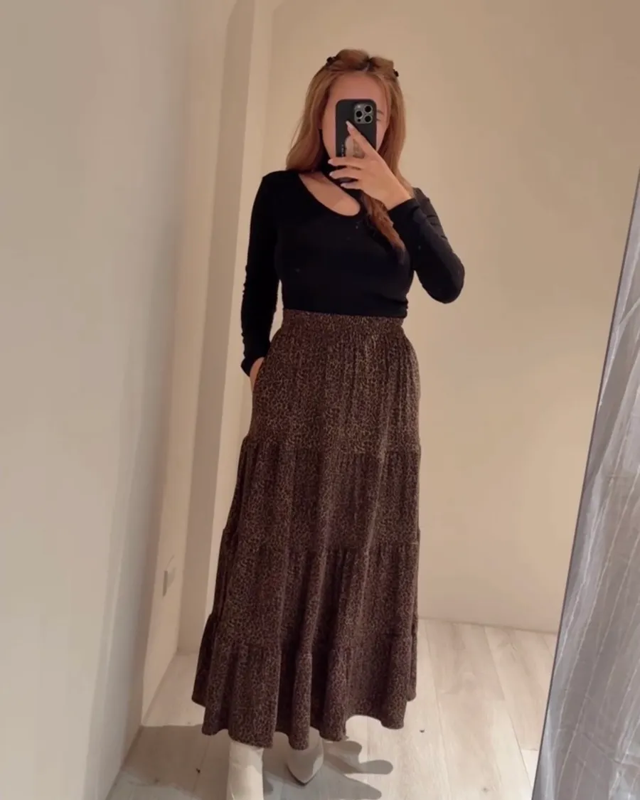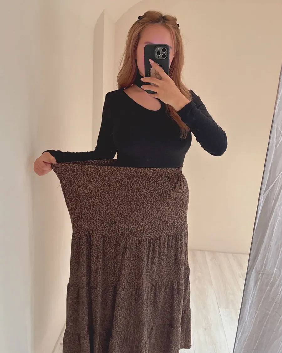 藏肉又顯瘦的神級長裙🐆高彈力布料+細緻豹紋紋理走路帶風、舒適不緊繃✨誰說豹紋只能性感?這款完全是日常也能穿的「氣質豹」柔軟高彈布料讓行走間超順身鬆緊高腰自然收腰修飾比例布料厚度剛好、不貼腿、不卡肉搭配貼身上衣或針織外套都超有造型感🤎