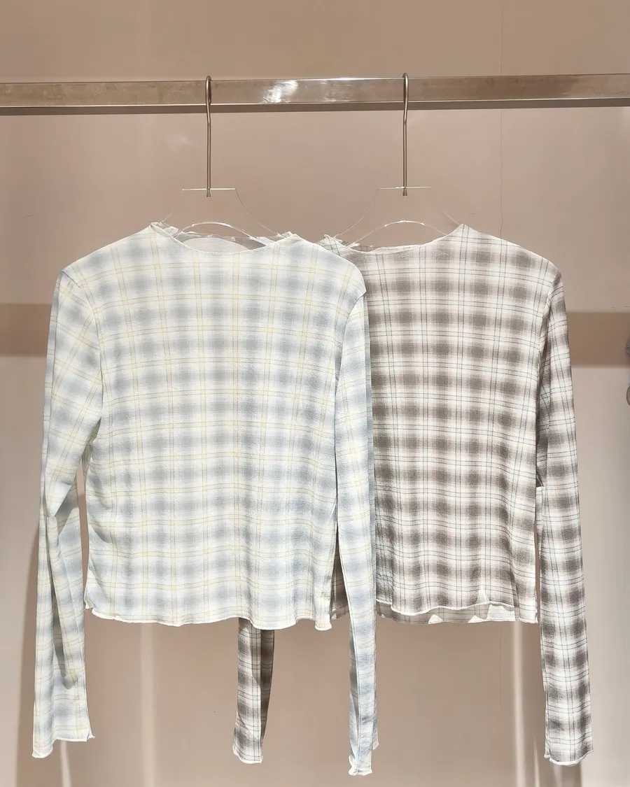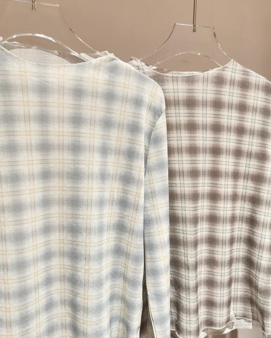 微醺柔焦.微透膚感合身格紋長袖上衣