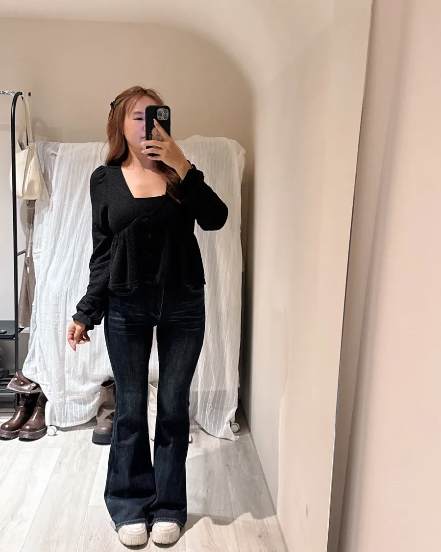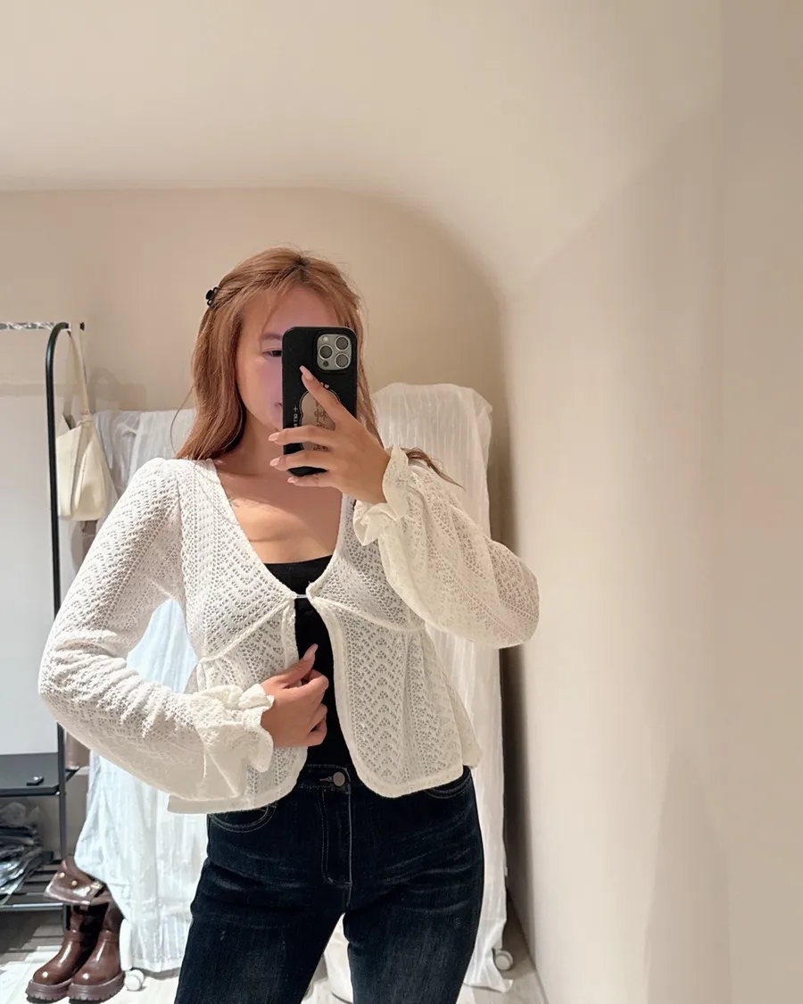 柔軟透氣的針織材質+微泡袖設計配上前短後微傘的剪裁,真的超顯比例又藏肉!立體編織針織布料微微澎袖+前開扣設計修飾肩膀線條下擺自然散開,剛好遮住腹部、拉出腰線單穿內搭小可愛或背心都很好看搭牛仔寬褲、短裙都能穿出韓系歐膩感