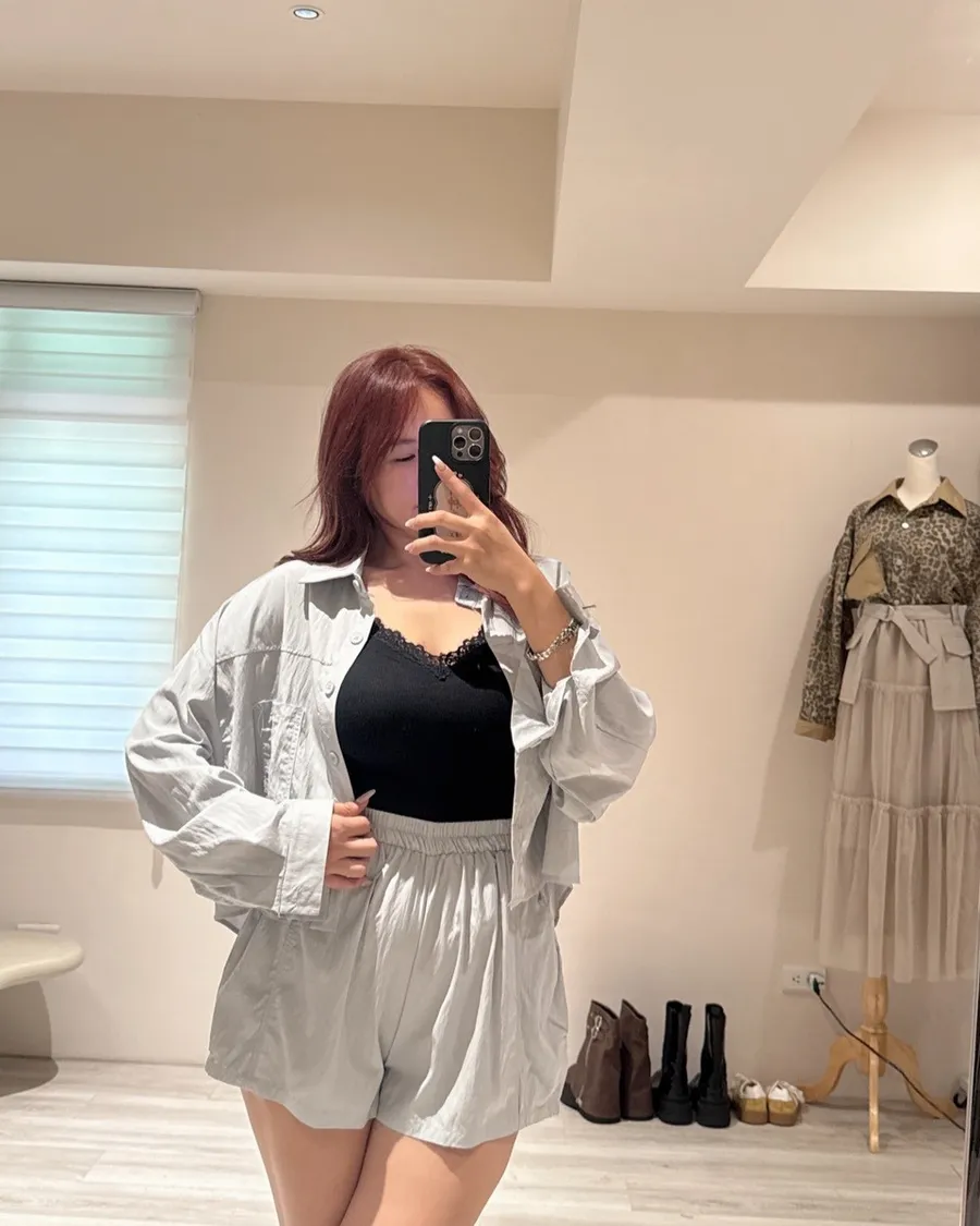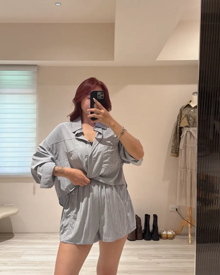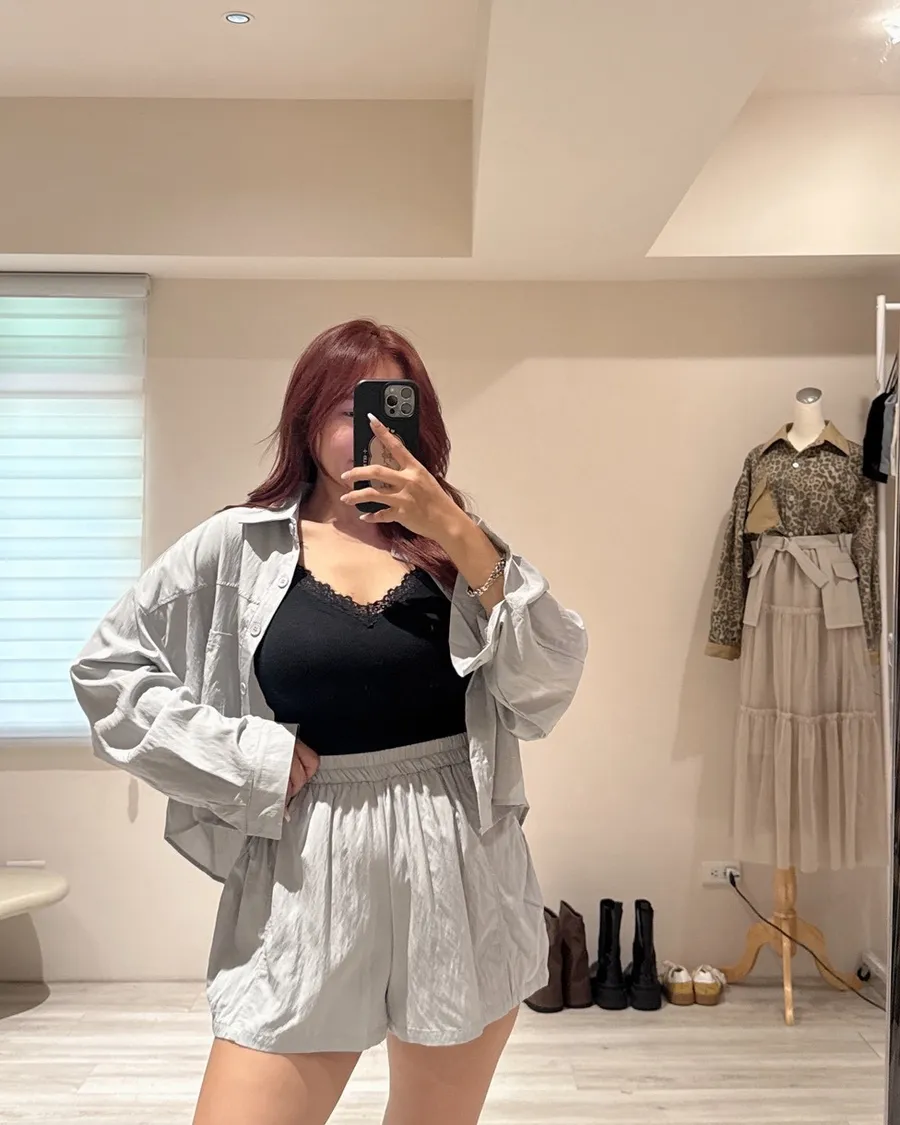 襯衫+高腰短褲,面料帶細緻霧面光澤
