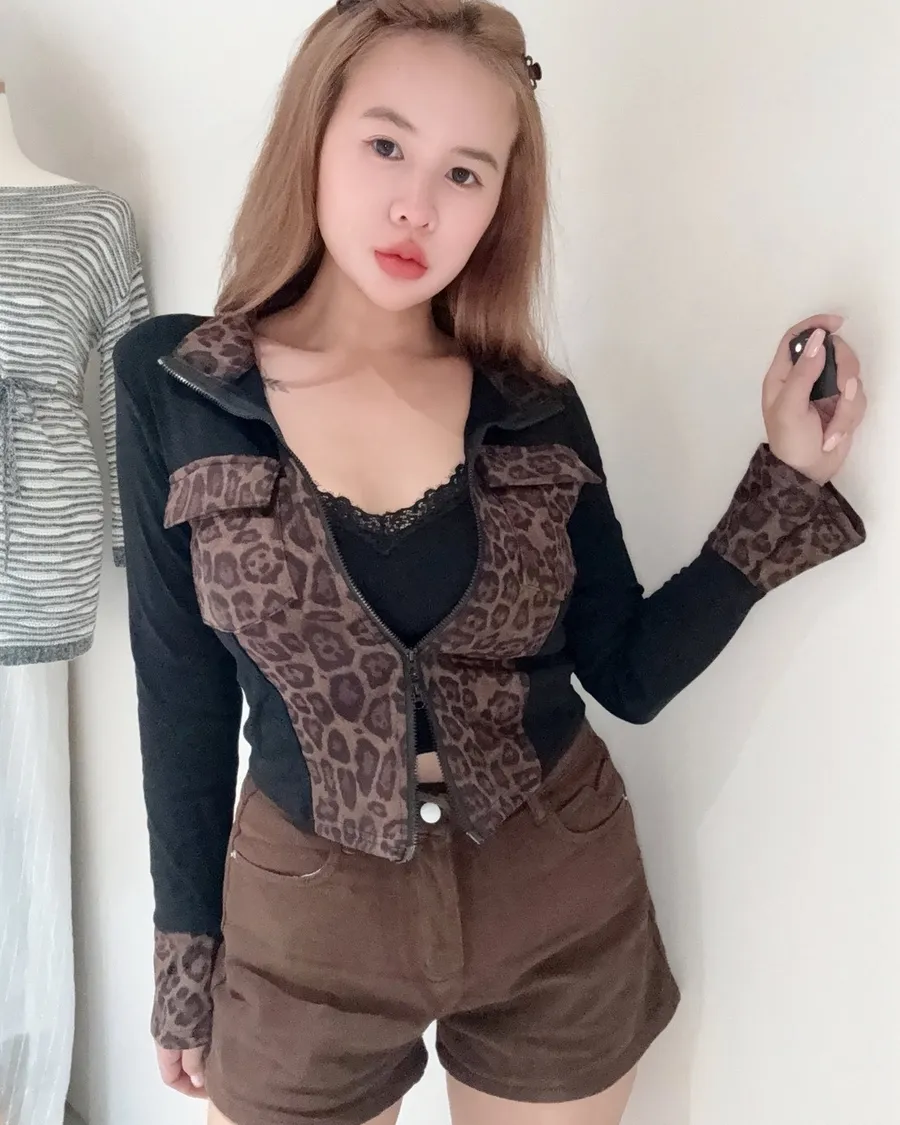 麂皮豹紋💋拼接雙向拉鍊上衣🐆