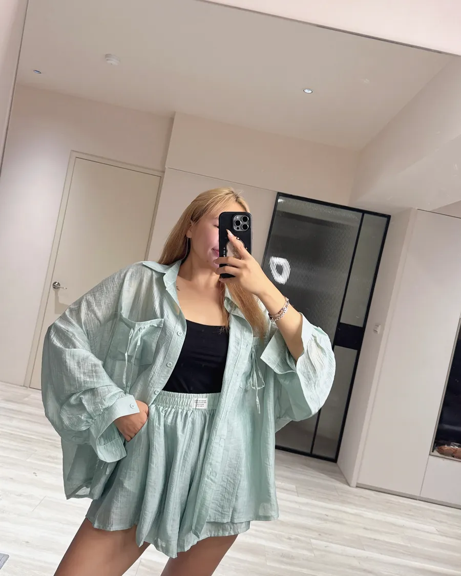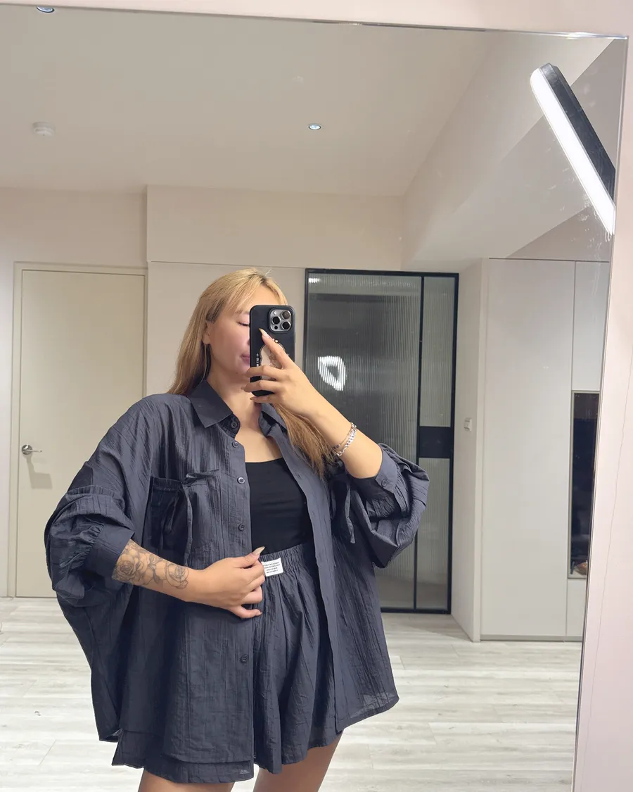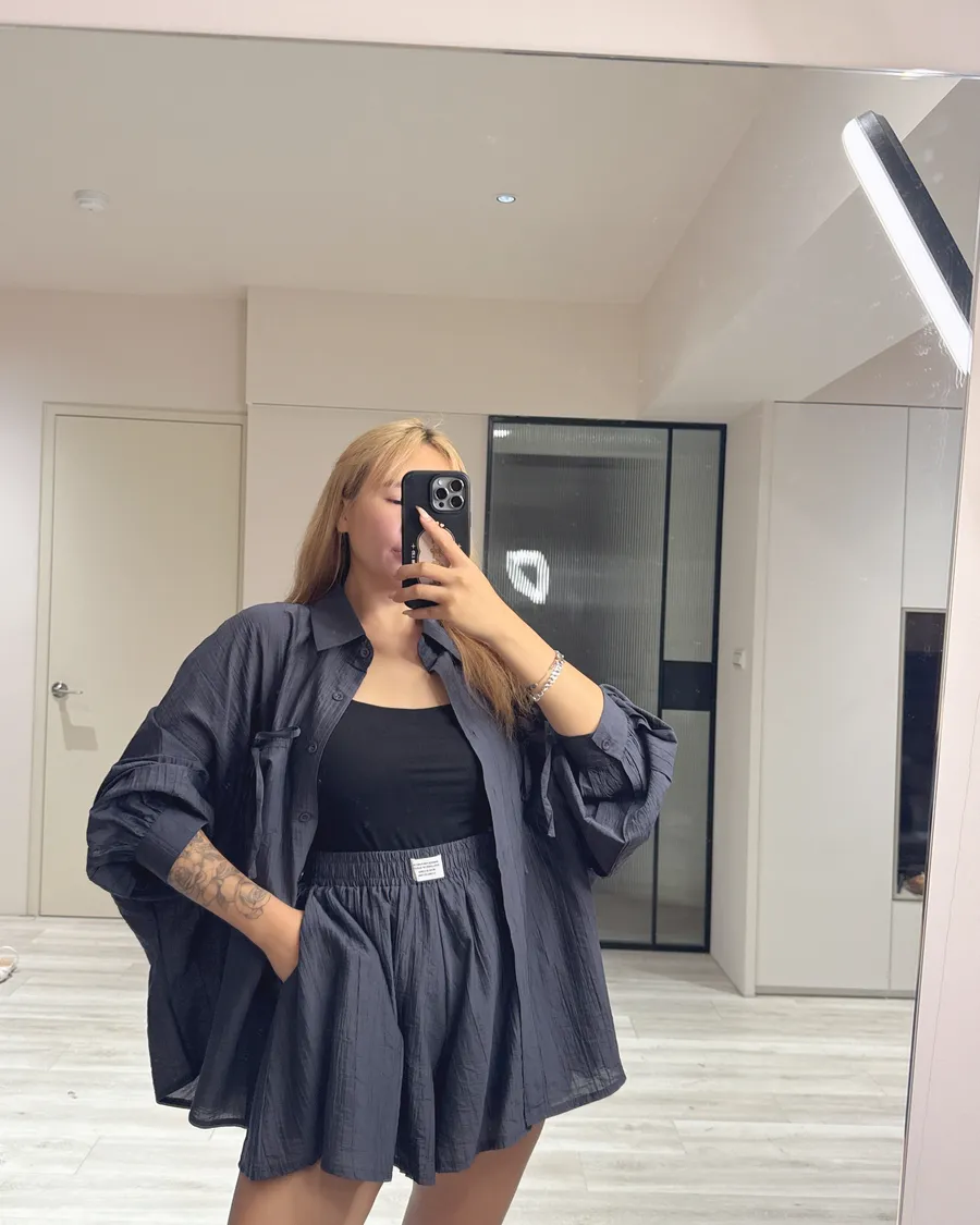 Oversize 襯衫遮肉顯瘦,高腰短褲修飾腿型