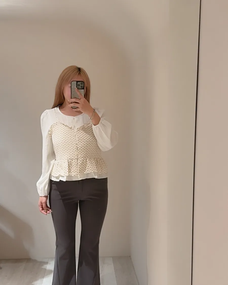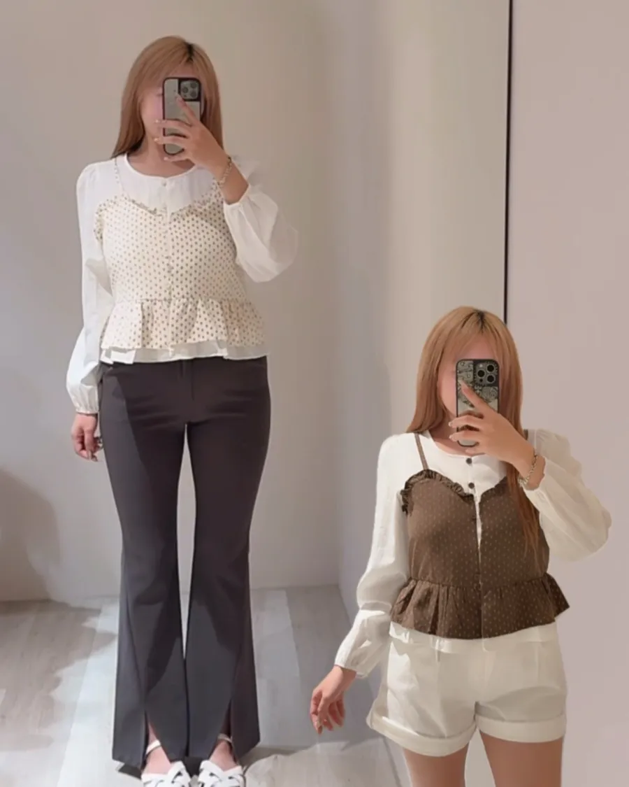 赫本風·波點拼接假兩件傘擺束口袖上衣
